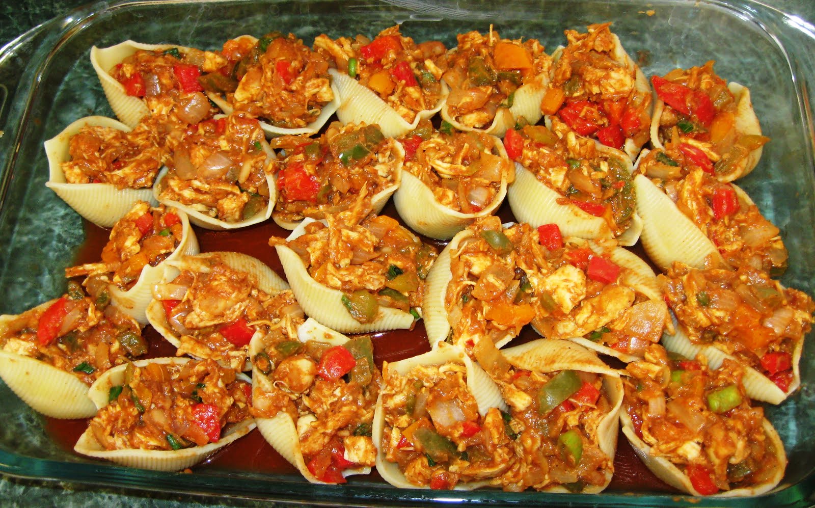 Spread about 1 1/2 cups of remaining enchilada sauce on bottom of pan. I used a 9 x 13 and a pie plate. Divide filling among shells. Arrange shells on top of sauce. Drizzle with more enchilada sauce, I didn't use all of it. Sprinkle lightly with shredded cheese.